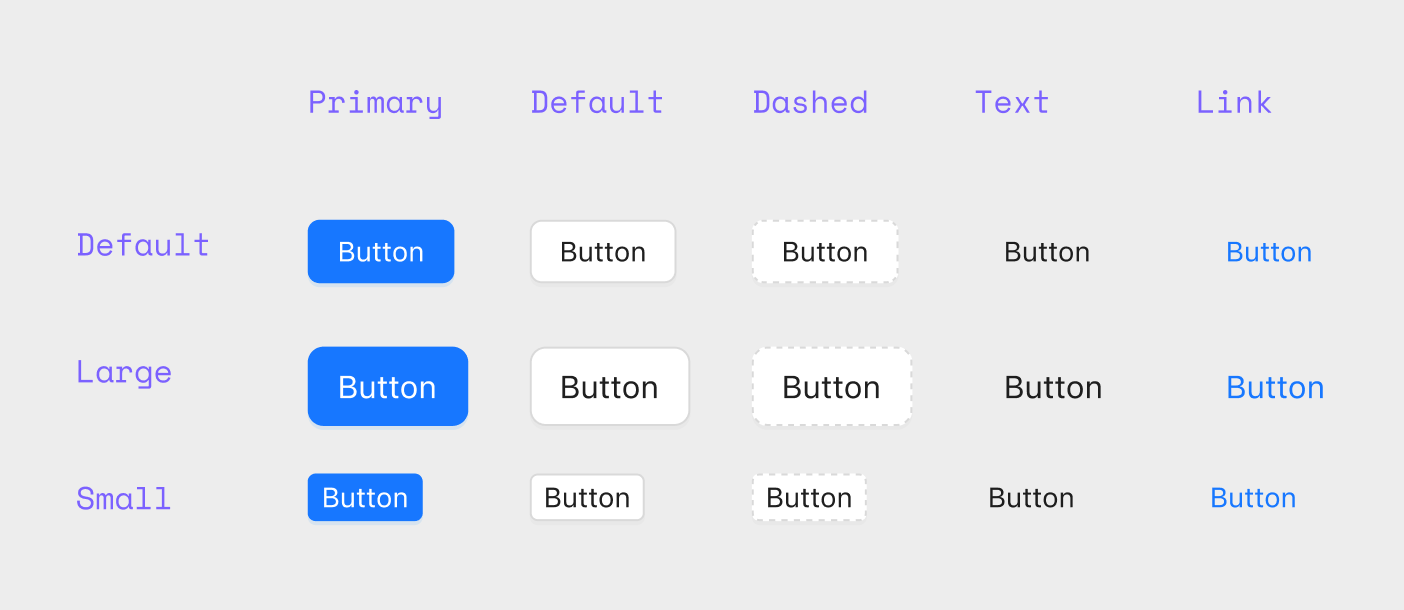 Component definitions (e.g., buttons, selection lists) for style, variations, interactions, and use cases