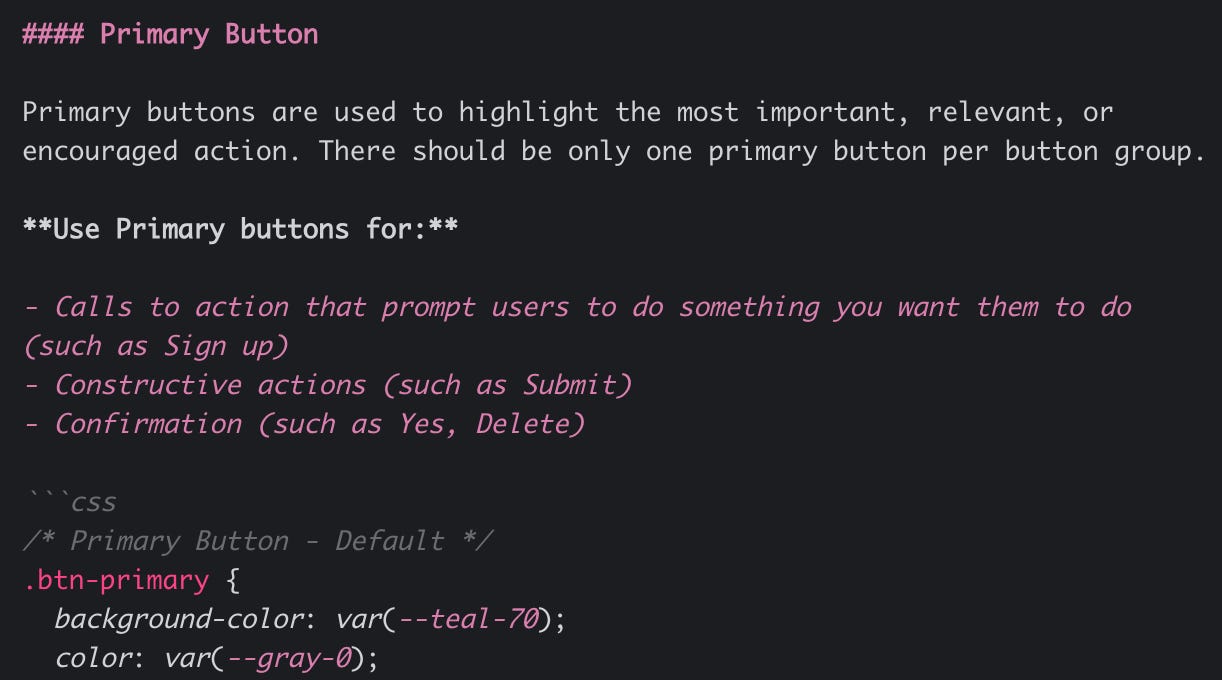 The goal is to provide clear, concrete, and concise instructions that represent your design system. This includes, but is not limited to: